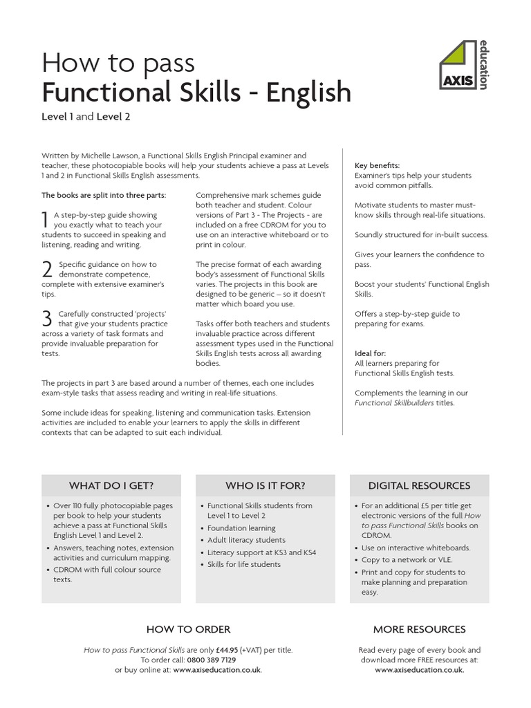 Associate Degree in Education BEd. Some of the worksheets displayed are Teachers guide functional skills english levels 1 2 More functional skillbuilders english Functional skills english reading level 1 Functional skills english entry level 3 first draft Scheme of work functional skills level 1 Functional. Over 110 fully photocopiable pages per book to help your students achieve a pass at Functional Skills English Level 1 and Level 2.